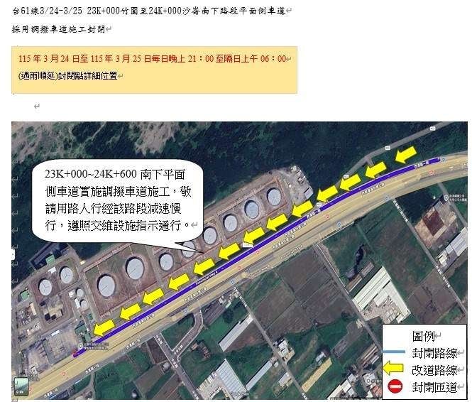 為辦理路面品質維護作業,交通部公路局北區養護工程分局中壢工務段將於3月24日至3月25日每日晚上21時至隔日上午6時止實施調撥車道施工,封閉台61線南下23K~24K路段平面側車道,車行時間約增加5分鐘。
