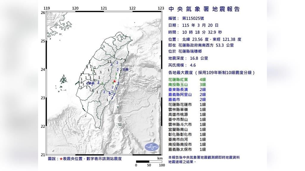 今(20)日上午10時18分,花蓮縣瑞穗鄉發生芮氏規模4.6地震,震央位在花蓮縣政府南南西方53.3公里處,地震深度16.8公里,屬於極淺層地震。