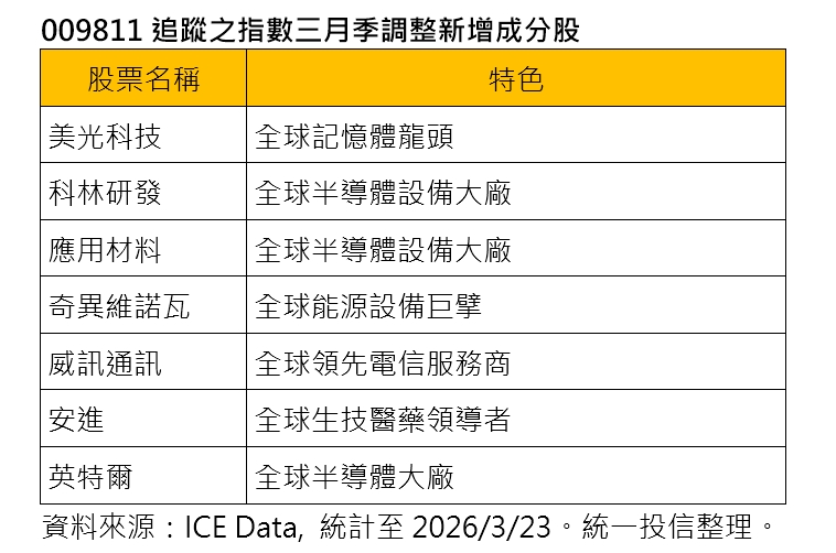 本次成分股調整已於今(23)日生效,追蹤該指數的統一美國50ETF(009811),也將緊隨指數調整投資組合。