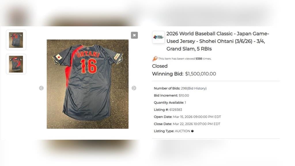 體育中心/綜合報導大聯盟近期將2026WBC(世界棒球經典賽)各隊比賽用品放上官方網站進行拍賣,其中日本武士二刀流巨星大谷翔平面對台灣所穿的球衣今(3/23)結標,飆出150萬10美元(約4816萬新台幣)天價。