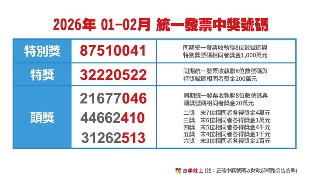 最新一期統一發票開獎了!2026年01-02月統一發票獎獎號今天公布,千萬特別獎中獎號碼為「87510041」;200萬元特獎中獎號碼為「32220522」,快來看看自己有沒有中獎吧!