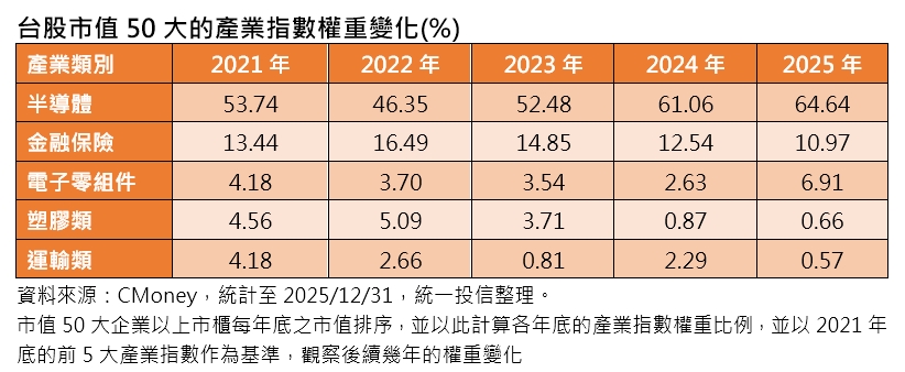 根據CMoney統計至去年底,近5年台股前50大市值公司的產業結構,出現明顯變動。半導體2021年產業權重為53.74%,2022年受聯準會升息與高通膨影響,產業權重一度下滑至46.35%,但隨後在AI需求帶動與資金回流下,股價逐步回升。近2年權重皆維持在6成以上,並於2025年接近65%。