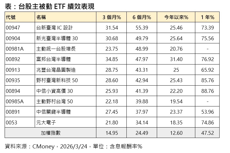 從盤面績效來看,半導體相關ETF近半年表現嚇嚇叫,像是台新臺灣IC設計(00947)、新光臺灣半導體30(00904),分別強彈55.39%、49.79%;股價漲幅超過4成的,還包括主動統一台股增長(00981A)、富邦台灣半導體(00892)、兆豐台灣晶圓製造(00913)、野村臺灣新科技50(00935)與中信小資高價30(00894)等,多屬於半導體及科技型。