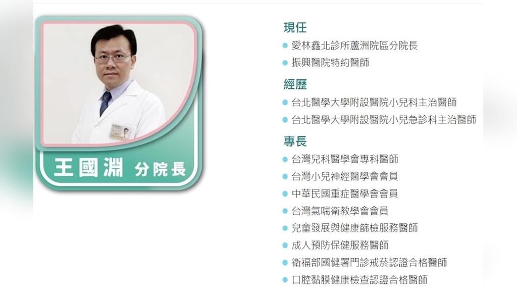 經查,死者為愛林鑫北診所蘆洲院區分院長王國淵,過去曾任台北醫學大學附設醫院小兒科及小兒急診科主治醫師,許多家長表示,孩子從小就由王醫師照顧,是家長們的依靠,稱讚醫師細心、專業,甚至會親自一一致電表並關切孩子的健康狀況,連排斥看病的孩子們都只願意給王醫師看診。