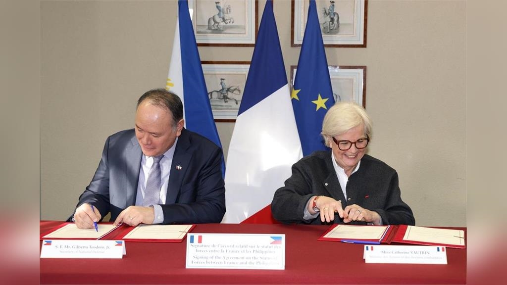 路透報導指出,菲律賓防長鐵歐多洛(Gilberto Teodoro)與法國防長沃特蘭(Catherine Vautrin)26日在巴黎會面,雙方除了針對歐洲以及東南亞區域面臨的安全挑戰交換意見,同時也重申對基於國際法的世界秩序的支持,並且簽署了軍事互訪協議(visiting forces agreement)。
