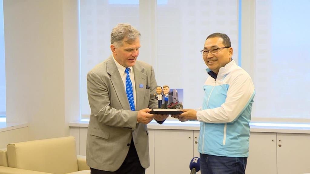 送上Q版人物公仔,還有客製化腳踏車模型,新北市長侯友宜繼2023年後,二度會晤世界自行車日發起人,分享新北綠色交通成果。
