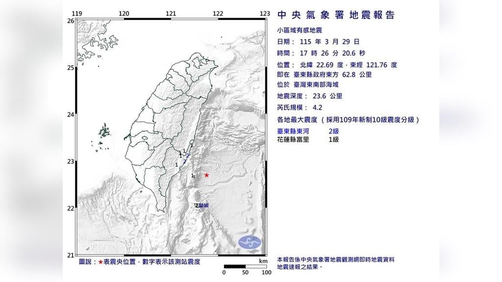 氣象署指出,今日17時26分,台灣東南部海域發生規模4.2的有感地震,震央位於台東縣政府東方62.8公里,深度為23.6公里。