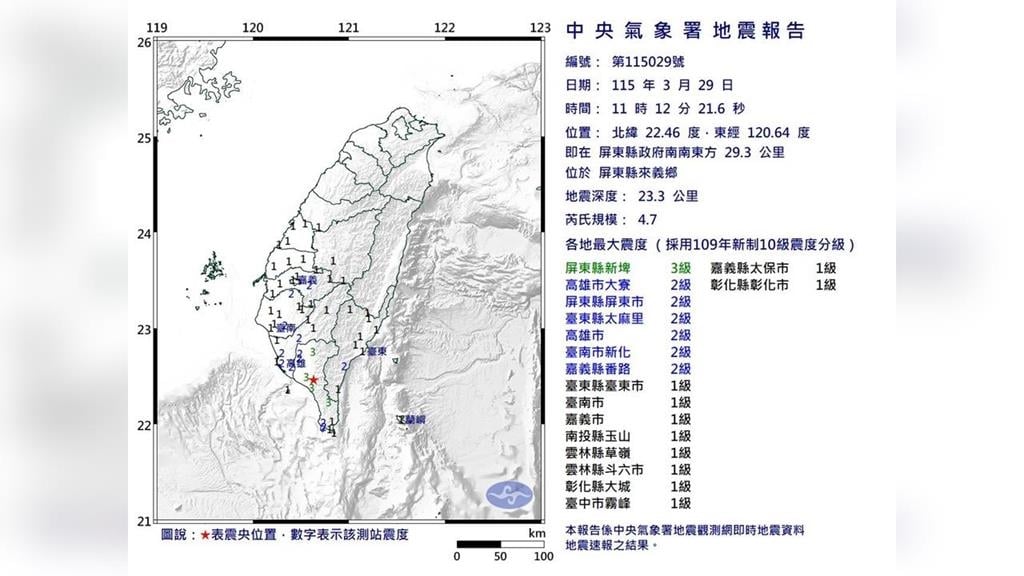 南台灣地牛翻身!今(29)日上午11時12分,屏東縣來義鄉發生芮氏規模4.7地震,地震深度23.3公里。全台10縣市有感,各地最大震度屏東3級。