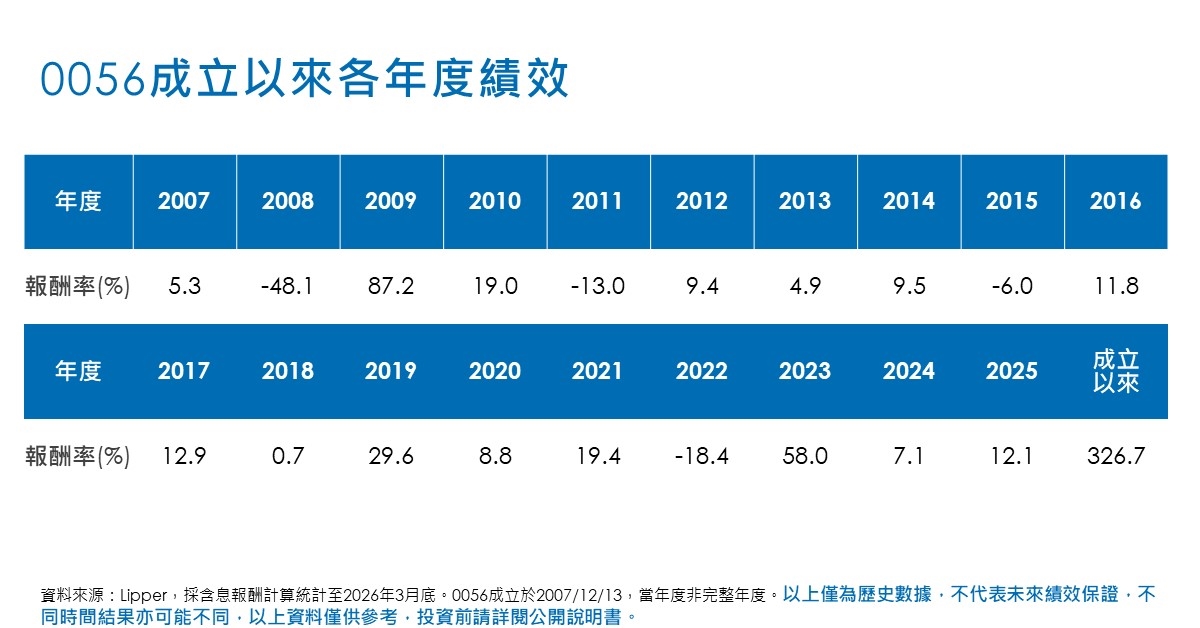0056連續配息紀錄將進入第16年。截至3月31日,元大投信官網顯示,0056帳上包含股息收入的可分配收益4.57元、包含資本利得的資本平準金7.37元,以目前配息水準估算,持續具有配息基礎。