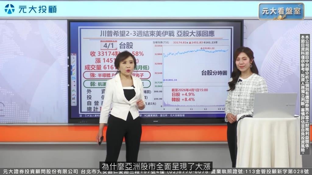 財經中心/綜合報導受美國總統川普表態中東軍事行動可望於近期結束的利多激勵,全球市場避險情緒降溫,美股週二率先強彈。週三亞股同步慶祝,台股在權王台積電領軍下,開盤大漲逾 169 點,站上 31892 點。值得關注的是,三大法人同步回頭大舉買超,其中自營商買超 216 億元,創下史上第二大紀錄,顯示市場資金正加速回流台股。<理財最錢線>為您站在第一線!主持人 元大投顧董事長 胡睿涵/證券分析師、來賓 元大投顧專業資深經理 周宛瑩/證券分析師