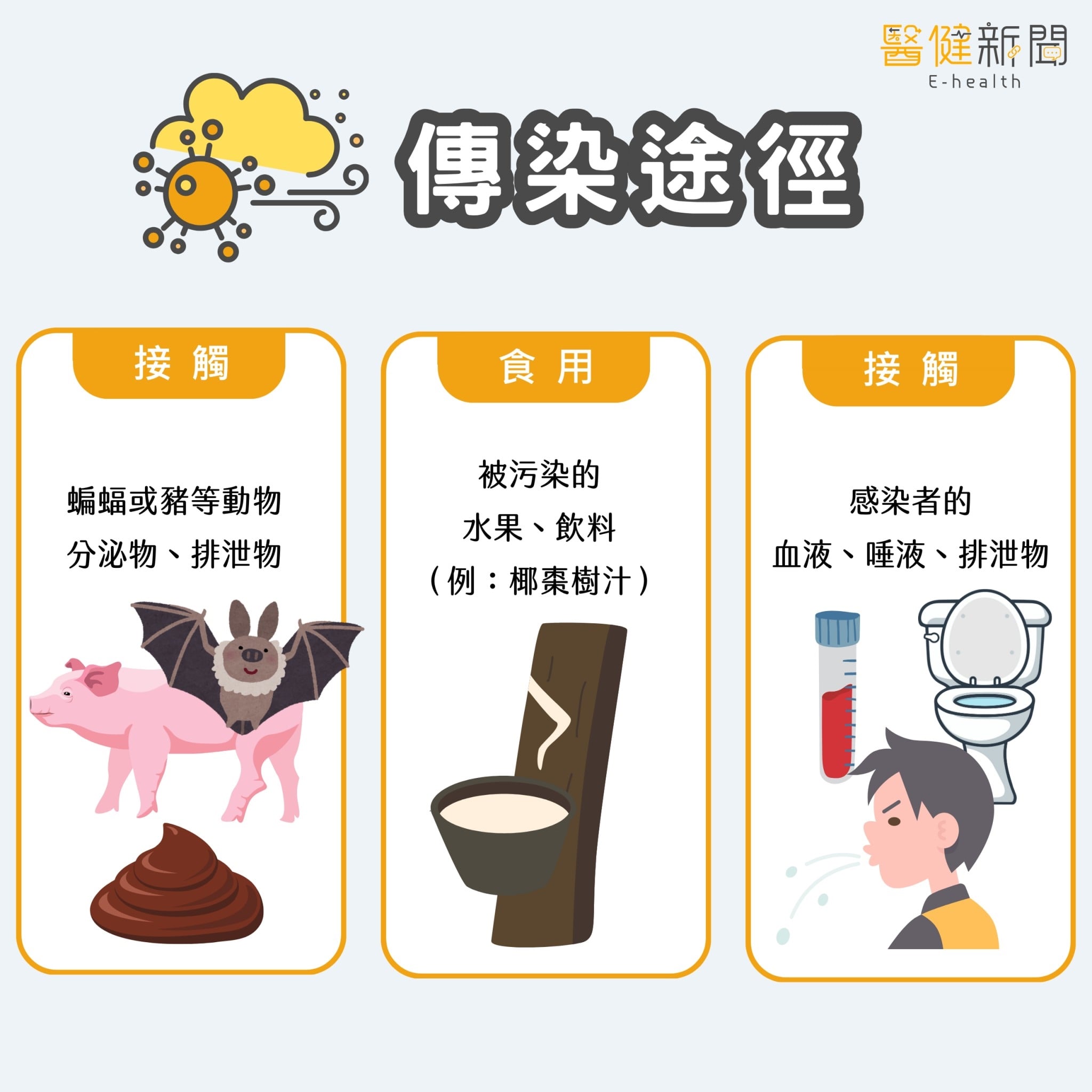 1.動物傳人:立百病毒可透過包括果蝠、豬隻等傳染給人,主要是接觸生病豬隻或經由呼吸道飛沫等途徑所感染。