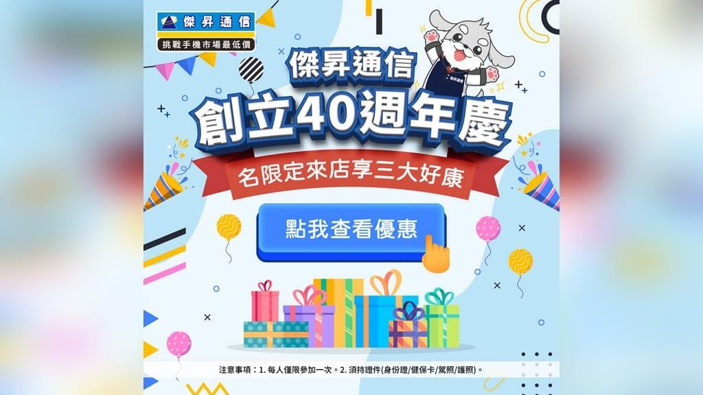 這次的 40 週年慶活動規則超級簡單,只要姓名發音中,包含「傑、昇、通、信、四、十、週、年、慶」這 9 個字裡面的任一字,就能獲得參加資格!您是符合資的幸運兒嗎?帶著你的證件來傑昇通信門市,我們準備了滿滿的驚喜好禮要送給你。
