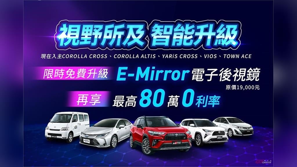 圖、文/購車趣Toyota感謝廣大消費者長期的支持與肯定,2026年1 至3月底累積銷量近3萬台 (市占率30.6%),為進一步回饋消費者,Toyota於4月份推出「視野所及 智能升級」活動,即日起入主COROLLA CROSS、COROLLA ALTIS、YARiS CROSS、VIOS以及TOWN ACE限時免費升級E-mirror電子後視鏡,再享最高80萬0利率。