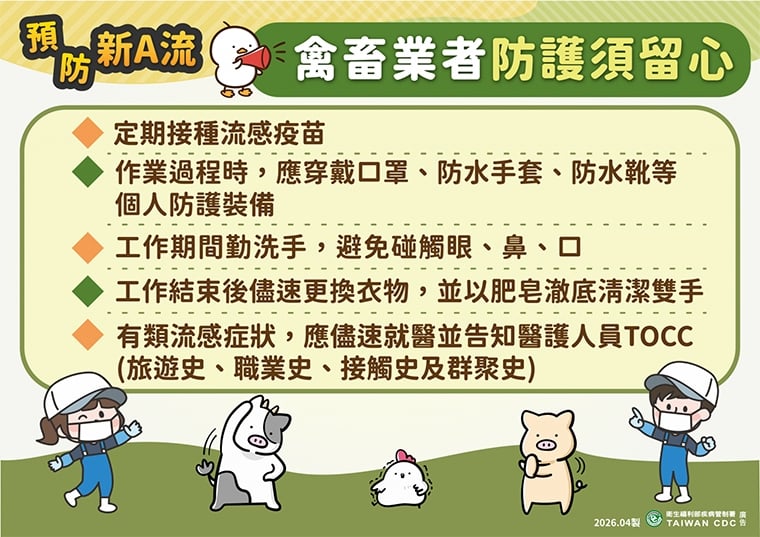 疾管署提醒,為降低新型A型流感感染風險,禽畜養殖相關工作人員在作業過程中應落實自我防護,於工作結束後落實清消。若出現急性呼吸道感染或結膜炎症狀,應儘速就醫並主動告知醫療人員其職業與動物接觸史,以利早期診斷。