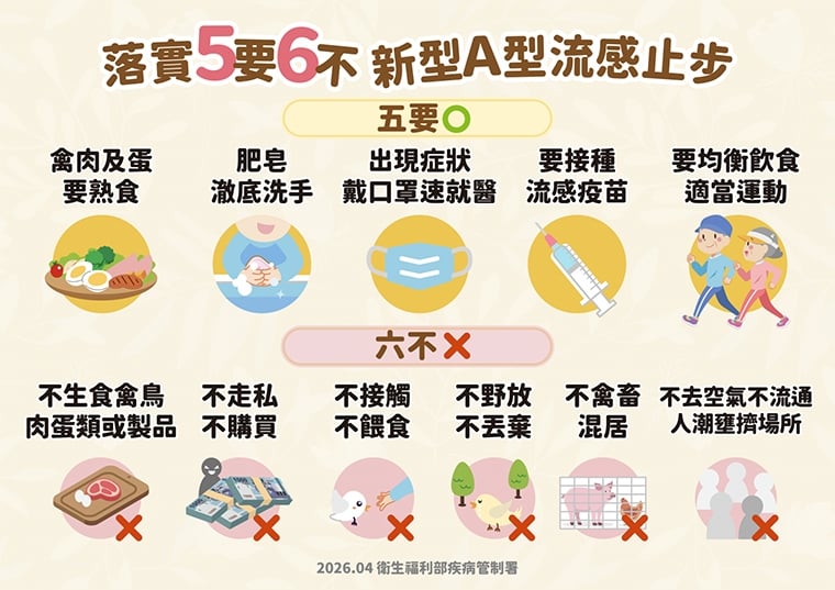 降低新型A型流感染病風險 民眾應於日常生活落實5 要 6 不防疫原則