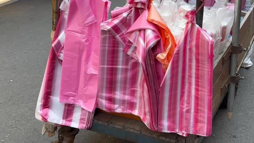 老闆邊叫賣、邊裝菜,攤位上掛的大大小小塑膠袋,現在珍貴的很,因為就算買得到,進貨成本也至少多3成。民眾共體時艱,不跟老闆要袋子,提著皺巴巴、明顯使用過的塑膠袋來買菜。