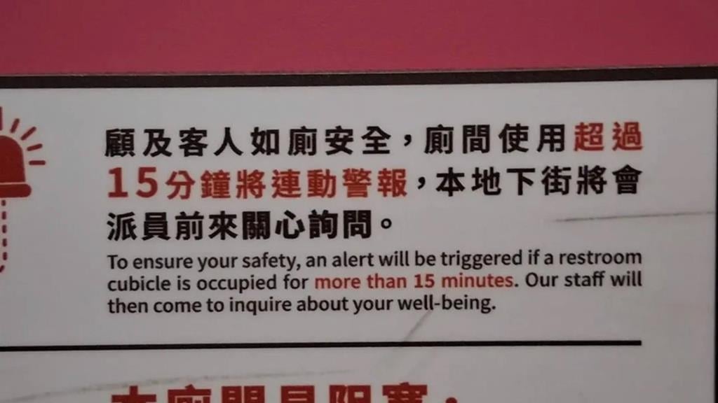網路上對於台北捷運廁所的安全預警機制看法兩極,近日一名網友發文分享親身經歷,表示自己曾於女廁待滿20分鐘,不僅警報沒響也無人敲門關心。反觀其他網友則是哀聲連連,有苦主表示「上到一半被敲門,害我差點縮回去」;還有人目睹隔壁間因待太久被關切,裡頭的人大喊「我在大便!」讓全場安靜。更有網友聯想到國外經驗,指紐西蘭廁所10分鐘門會自動打開,讓網友感嘆「人生最渺小的幾秒鐘」。針對警報機制,有內行網友指出,感應器其實藏在門鎖中。若擔心待太久會引發警報,可以在14分鐘時將門鎖輕輕「拉開再重新鎖上」時間就會重新計時。目前已有網友實測台北轉運站的廁所能以此方式操作。