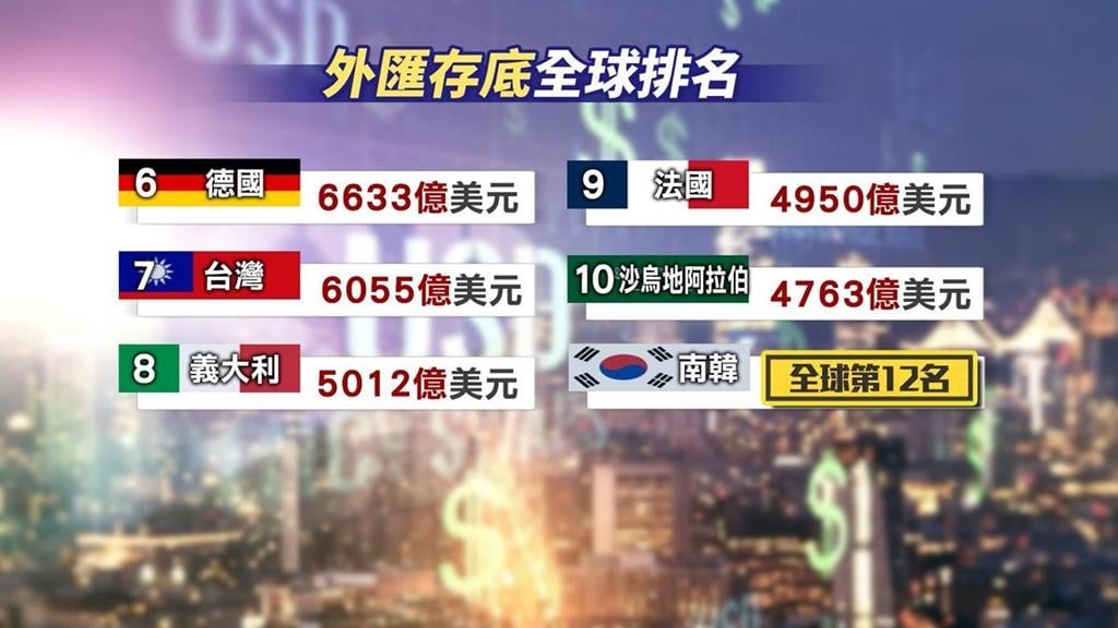 根據各國央行公布數據,截至2月底,全球外匯存底排名,中國以3.43兆美元奪冠,日本和瑞士分別以1.41兆美元、1.11兆美元緊追在後,台灣則以6055億美元,排在世界第7,超越義大利5012億美元、法國4950億美元、以及沙烏地阿拉伯得4763億美元。至於南韓因為陷入韓元保衛戰,外匯存底4276億美元,排在第12名,更是26年來首次跌出全球前10名。外匯分析師李其展:「最近美國公債下跌、那美元也走強,所以如果要找得到美元公債多,它可能表現出來的價值就下降了;那或者是什麼歐元也會因為美元走強,所以造成了整體的美元、就換算成美元的之後,它都會整體下降。」
