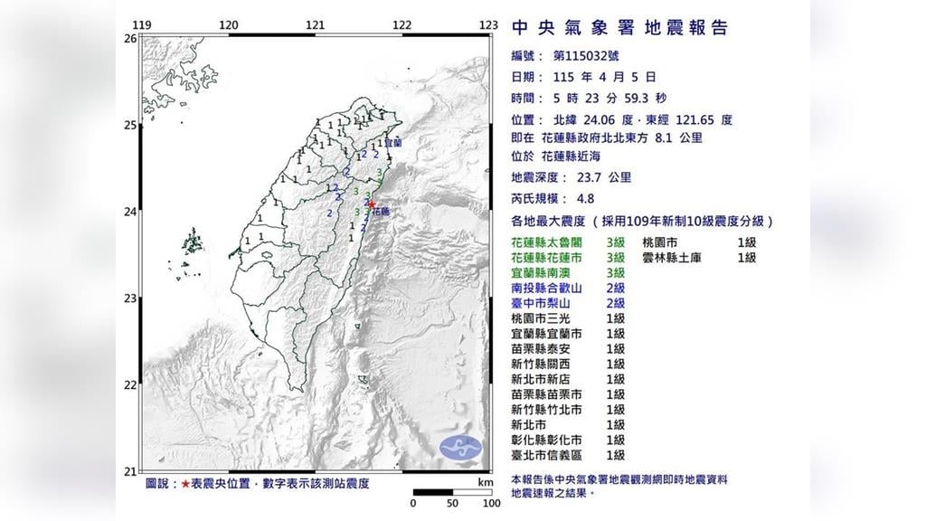清晨再震!花蓮縣近海今(5)日05時23分發生有感地震,芮氏規模4.8,最大震度3級,出現在花蓮縣太魯閣、花蓮縣花蓮市、宜蘭縣南澳鄉。