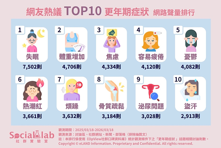提到更年期,不少人第一時間想到的往往是「熱潮紅」,但實際上,這段生理轉變期所帶來的影響遠比想像中更廣泛。《Social Lab社群實驗室》透過《OpView社群口碑資料庫》追蹤近1年「更年期症狀」相關話題的網路聲量,整理出網友熱議的10大更年期症狀,其中前3大包含失眠、體重增加和焦慮,來看看這些變化如何影響日常生活。