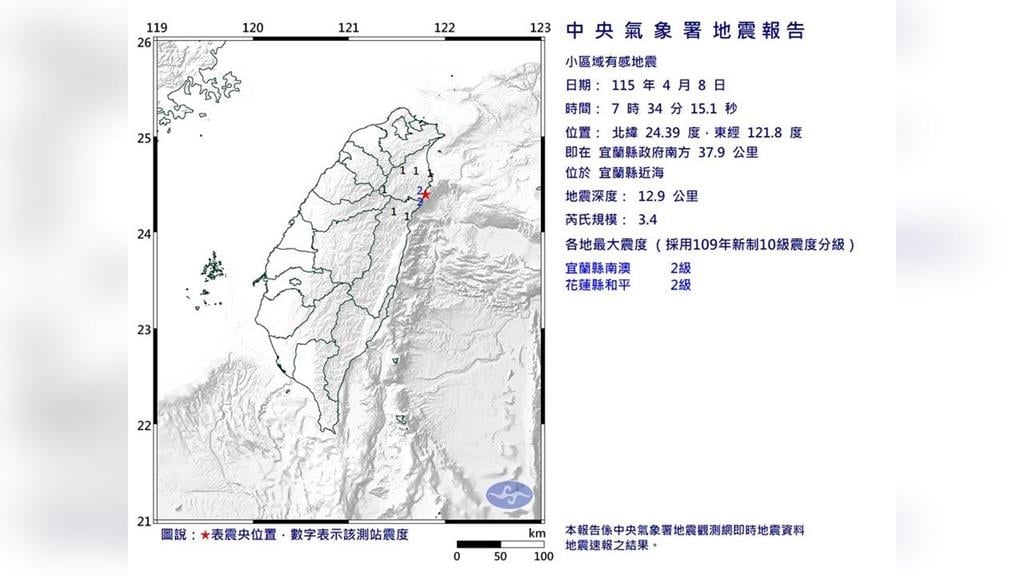 氣象署指出,今日7時34分,宜蘭縣近海發生規模3.4的有感地震,震央位於宜蘭縣政府南方37.9公里 ,深度12.9公里。各地最大震度, 宜蘭縣南澳2級、花蓮縣和平2級。