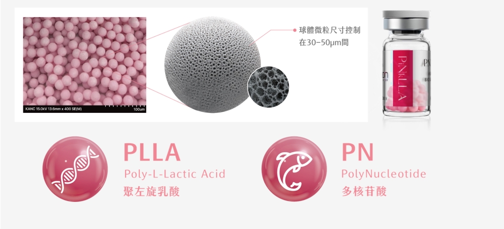 其中,PLLA 為由乳酸單體聚合而成的高分子材料,具備良好生物相容性與可分解性,在醫療領域已使用超過30年。進入肌膚後會形成微型支架,啟動免疫反應並活化纖維母細胞,誘導第一型膠原蛋白逐步生成,使肌膚恢復彈性與支撐力。其採用均一球形製程(30–50 μm),也有助於分布均勻並降低結節風險。