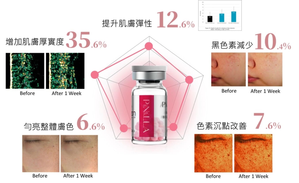 圖 /粉光瓶在短期內於肌膚厚度、彈性與色素表現上皆有改善趨勢,顯示其兼具膠原增生與膚色調整的多重作用。