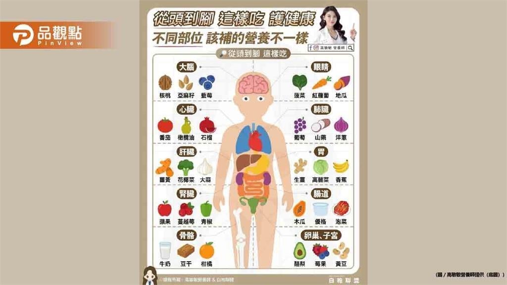 圖、文/品觀點從頭到腳這樣吃護健康,不同部位該補的營養不一樣,你知道嗎?每天吃進去的食物其實都在默默幫身體不同部位加分,有些食物特別適合補大腦,有些對心臟、腸道或女性健康更有幫助,只要吃對方向,就能把營養送到身體真正需要的地方,這張表幫大家一次整理吃什麼食物可以幫哪個部位補健康,照著搭配讓日常飲食更有方向。