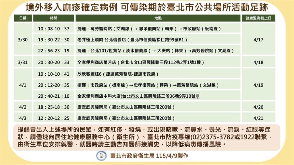 CNEWS匯流新聞網記者陳鈞凱/台北報導台北市新增1例麻疹境外移入確定病例!台北市衛生局今(10)日公布確診者為一名30多歲本國籍男性,衛生局目前光是針對個案的同住者、同事及就醫接觸者,就匡列接觸者多達383人;衛生局也同步公布個案在3月30日至4月3日的公共場所活動足跡,包括捷運萬芳醫院站、市政府站及老井極上燒肉(台北信義店)等多地,提醒曾出入上述場所的民眾進行健康監測。