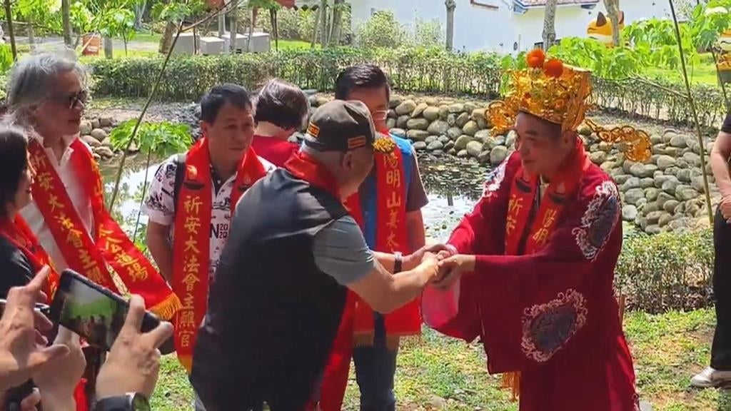 【原文出處】:苗栗桐花季開跑 鍾東錦扮土地公發麻糬「黏財」