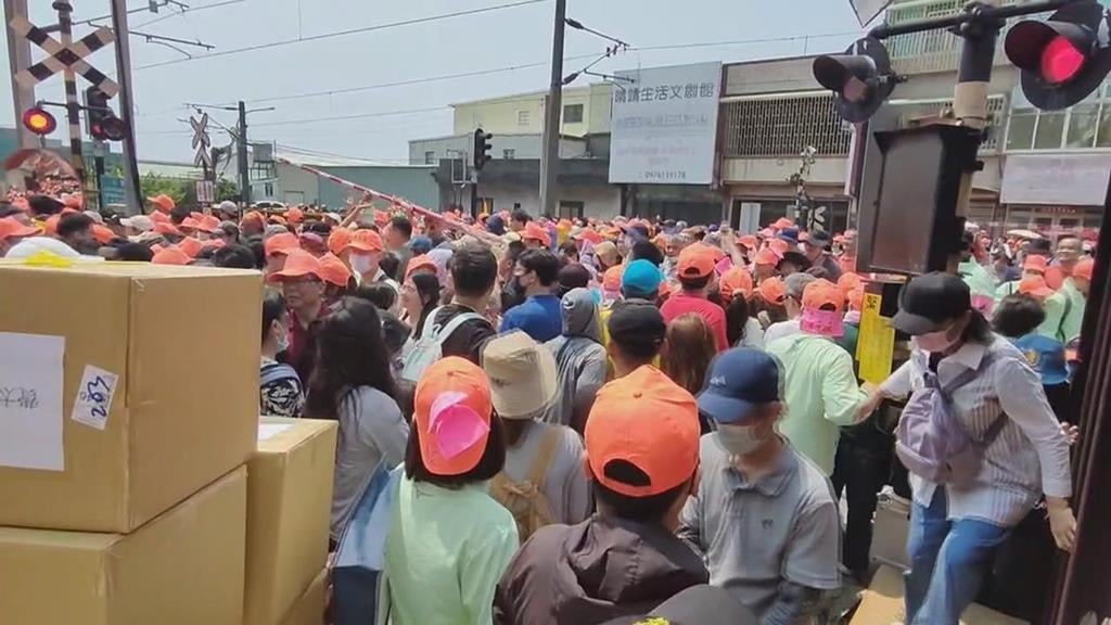 柵欄升起,機車騎士卡在人群中,緩慢移動,這是白沙屯拱天宮媽祖,起駕當天的盛況,不只平交道、車站人潮,一波又一波,前往拱天宮廟埕的道路,也是滿滿人潮,空拍畫面壯觀,彷彿大軍出征。