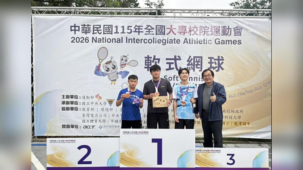 體育中心/季芸報導中央大學李禾丰在115年全國大專校院軟式網球一般男子組個人決賽,以4比1擊敗健行科大林璋輝,首度參賽就一舉奪金,也摘下本屆全大運首面金牌,接著再與隊友陳達緯拿下一般組男雙銅牌;團體賽事方面,成功大學以2比1擊敗淡江大學摘金,同時包辦女團、女雙金牌及混雙銅牌,斬獲3金1銅。