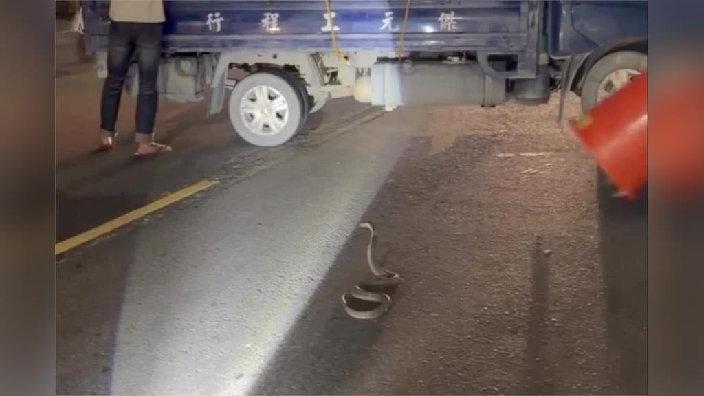 恐怖的是,這條眼鏡蛇「肇事」後,還在馬路中央撐開招牌頸部,對著倒地騎士虎視眈眈,為避免騎士遭到攻擊,一旁的熱心民眾還拿起塑膠桶朝眼鏡蛇丟擲,而農業局人員趕到場後,也順利將眼鏡蛇捕捉帶離,結束這場馬路驚魂。