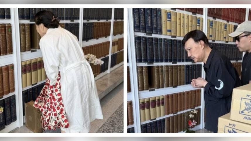 余祥銓透過社群平台分享多張照片,記錄一家人前往基隆基福山生命園區祭拜的過程。畫面中,余天身穿黑色外套,站在以書本造型設計的塔位前,雙手緊握、長時間低頭凝視,神情凝重且哀戚;李亞萍則身著白色服裝,獨自俯身靠近塔位停留,彷彿與女兒輕聲對話,背影顯得格外消瘦與哀傷,整體氛圍沉靜而壓抑。