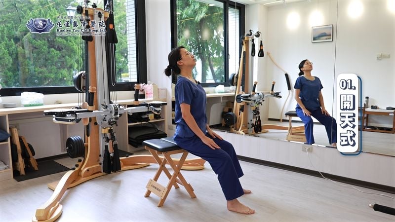 1.開天式:想像頭頂被向上拉伸,先向後仰吐氣,再回到中間,接著往前彎呈圓背狀並吐氣,反覆進行以減壓脊椎。