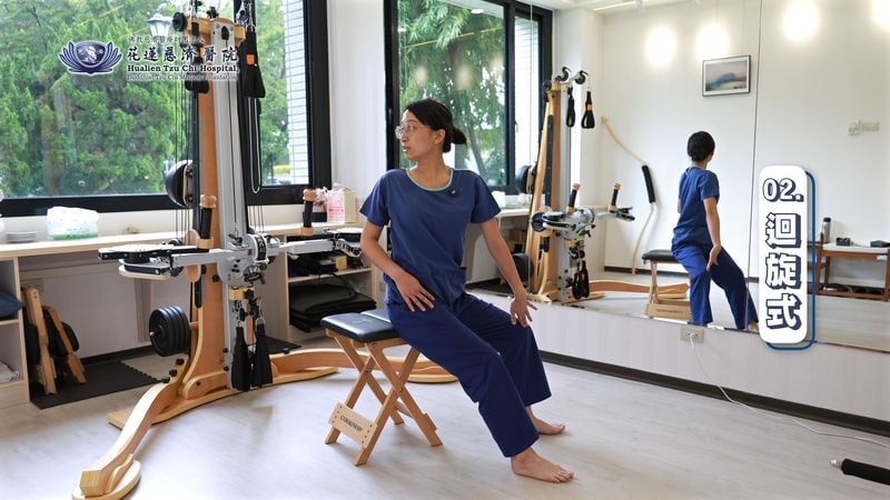 為改善外送員常見疼痛問題,花蓮慈院簡婕物理治療師設計四招坐在椅子上即可完成的「嬋柔伸展」。她指出,嬋柔運動特別適合長時間坐姿工作者,包括外送員與久坐上班族。若能在每天接單前先進行脊椎暖身,讓脊椎各方向均衡伸展,不僅可提升身體舒展度,也有助提升騎車時的安全性。
