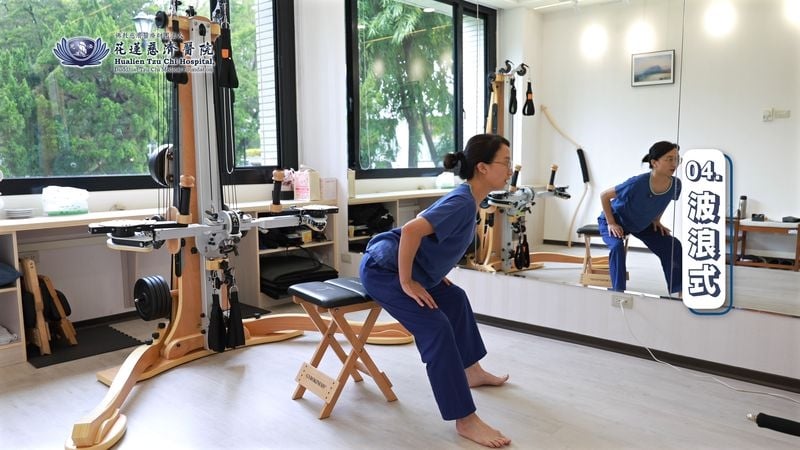 4.波浪式:身體如海浪般流動,從頸椎、胸椎到腰椎依序向前捲曲再拉伸,讓每節脊椎獲得均勻活動。