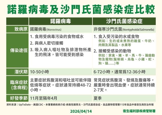 疾管署監測資料顯示,第14週(4月5日至4月11日)腹瀉門急診就診 125,205 人次,較前一週(3月29日至4月4日) 119,787 人次上升。另全國近四週(第11週至第14週)共接獲 113 起腹瀉群聚通報案件,發生場所以餐飲旅宿業最多;其中病原體檢驗陽性案件計 64 起,病毒性病原占87.5%(56起),以檢出諾羅病毒( 50起,占陽性群聚78.1%)為多,細菌型病原占12.5%(8起),分別檢出金黃色葡萄球菌4件、沙門氏菌3件及同時檢出金黃色葡萄球菌和沙門氏菌1件;另3月份諾羅病毒分型結果顯示, GII.17 為主要的流行型別,占約47.1%,與去年國內流行型別一致。