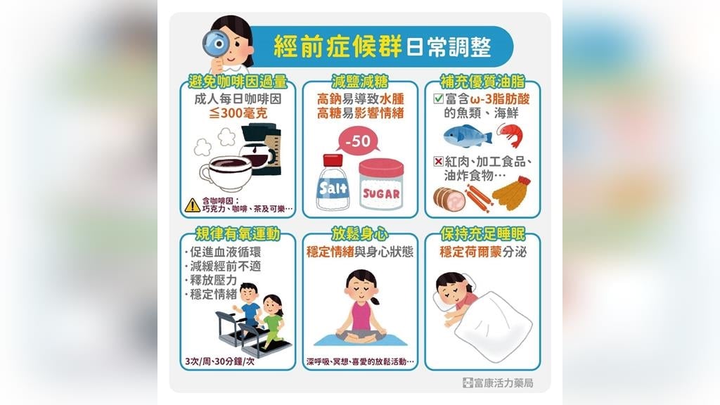張淯淵藥師提醒,若想減少經前不適,日常習慣的調整往往是第一步。首先,可減少過量咖啡因、酒精與高糖食物,因為這些因素可能讓焦躁、睡眠不穩與乳房脹痛更明顯。若本身容易水腫或腹脹,也建議留意鹽分攝取,避免高鹽飲食讓不適加重。