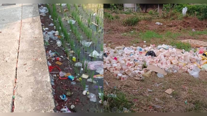 有民眾在臉署社團「白沙屯媽祖粉絲團公開社團」發文上傳數張照片,可以看見農田裡有各種塑膠袋垃圾、用過的紙碗、飲料瓶、鞭炮碎屑、檳榔汁等等,畚箕上也累積大量免洗筷。