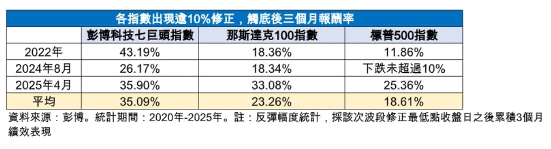 統計2020年至2025年,美股共有3次波段跌幅超過10%,分別發生在2022年、2024年8月以及2025年4月。統計指數下跌觸底後3個月的報酬數據,標普500指數平均上漲18.6%、那斯達克100指數平均上漲23.26%,彭博科技七巨頭指數平均報酬表現則達35%,且在每次修正的反彈表現皆勝出。
