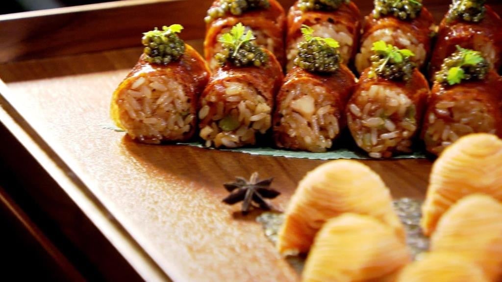 師傅直接片下兩大片鴨皮,再切成小塊,有多脆聽聲音就知道,接著用鴨皮包入八寶飯,還要捏一捏固定,彷彿捏壽司,最後再點綴魚子醬,這道菜其實是改良自老菜八寶鴨。餐廳廚藝總監鄔海明:「那只是外皮呢我們用烤鴨,我們把它胸口最脆的那些皮,把它片下來,然後把它捲起來之後呢,再呈現給大家,那這樣吃起來那個口感,跟我們傳統的八寶鴨就會不一樣。」