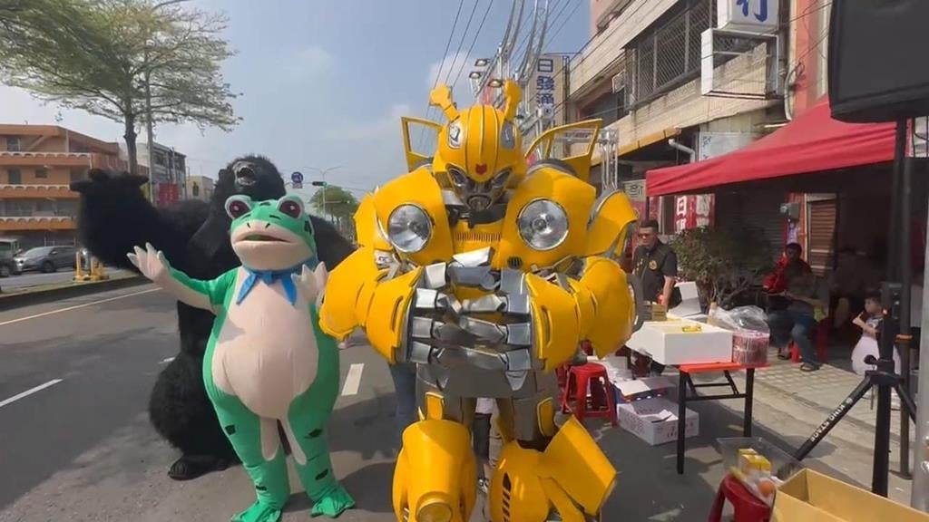 台中大甲鎮瀾宮媽祖繞境,周日沿著台一線,一路南下。有信眾掏腰包打造"大黃蜂"變形金剛裝,和大猩猩、青蛙人一起迎接媽祖,吸引不少目光。扮大黃蜂信眾:「200公分高,價格大概在兩萬五,因為廟會這個東西,就是要創新,不要一成不變,這樣可以增加廟會熱鬧,還有大家的參與感。」