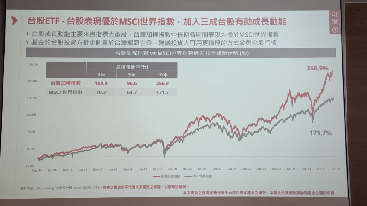 瀚亞投信強調,根據彭博統計至2025年12月底,台灣加權股價指數在中長期表現皆優於MSCI世界指數(如下圖,記者李錦奇攝影)。台股成長動能主要來自AI迅速崛起的受惠族群,基金投資策略亦聚焦於台灣具競爭力的企業,透過納入三成台股ETF,有助提升整體投資組合的成長潛力。