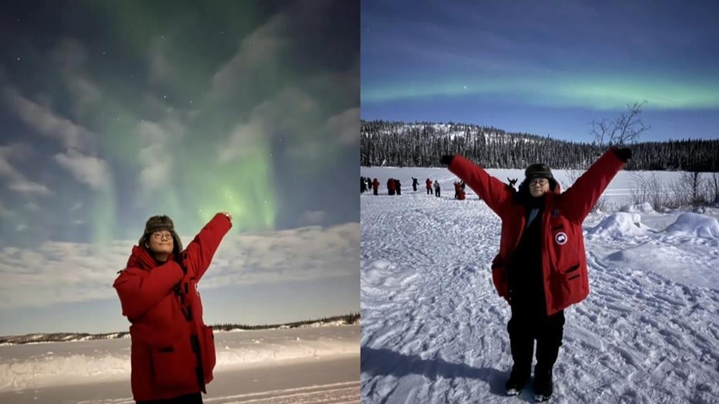 穿著紅色保暖外套、毛帽,站在冰天雪地中,與極光合照,大力比讚,但仔細一看,肚子的地方怎麼鼓鼓的,並不是身材太胖,而是揹著三袋的洗腎藥水!洗腎病友陳德生:「既然有存活率,我會不會洗了5年就不見了這樣子,所以趕快有夢要趕快去完成,所以我就去飛加拿大,12+3是飛到溫哥華,再加3小時飛到黃刀鎮的時間,我們的行李呢,一天就是,我的一天是3包(洗腎藥水),所以就是6公斤。」