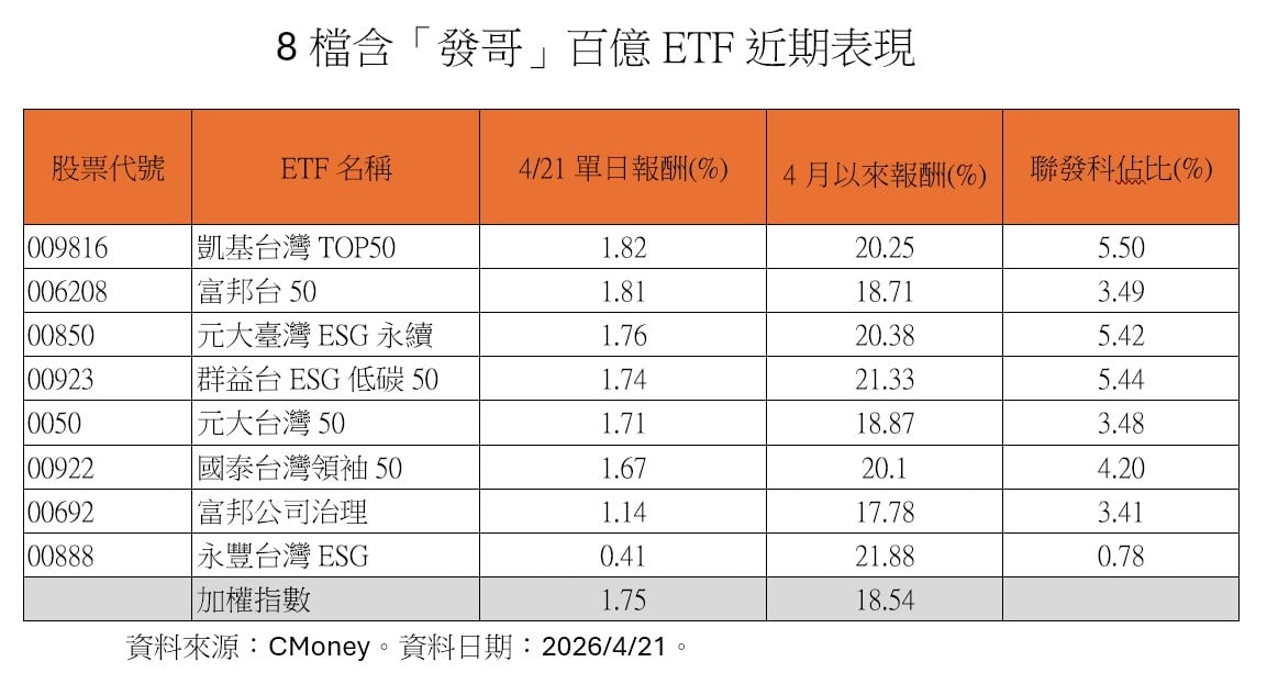 聯發科股價強力反彈,也帶動持有聯發科股票的大型市值型ETF,跟著受惠,總計4月以來,有8檔報酬率至少17%起跳,最強一檔含息報酬更逼近22%。