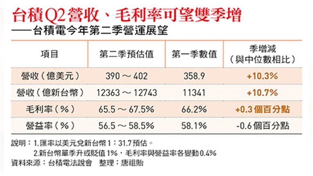 更驚豔的是,台積電原先預估第1季毛利率63%至65%、營益率54%至56%,而實際成績分別是66.2%與58.1%,雙雙超越財測,並同步改寫歷史新高;每股稅後純益(EPS)22.08元,也是單季新高。