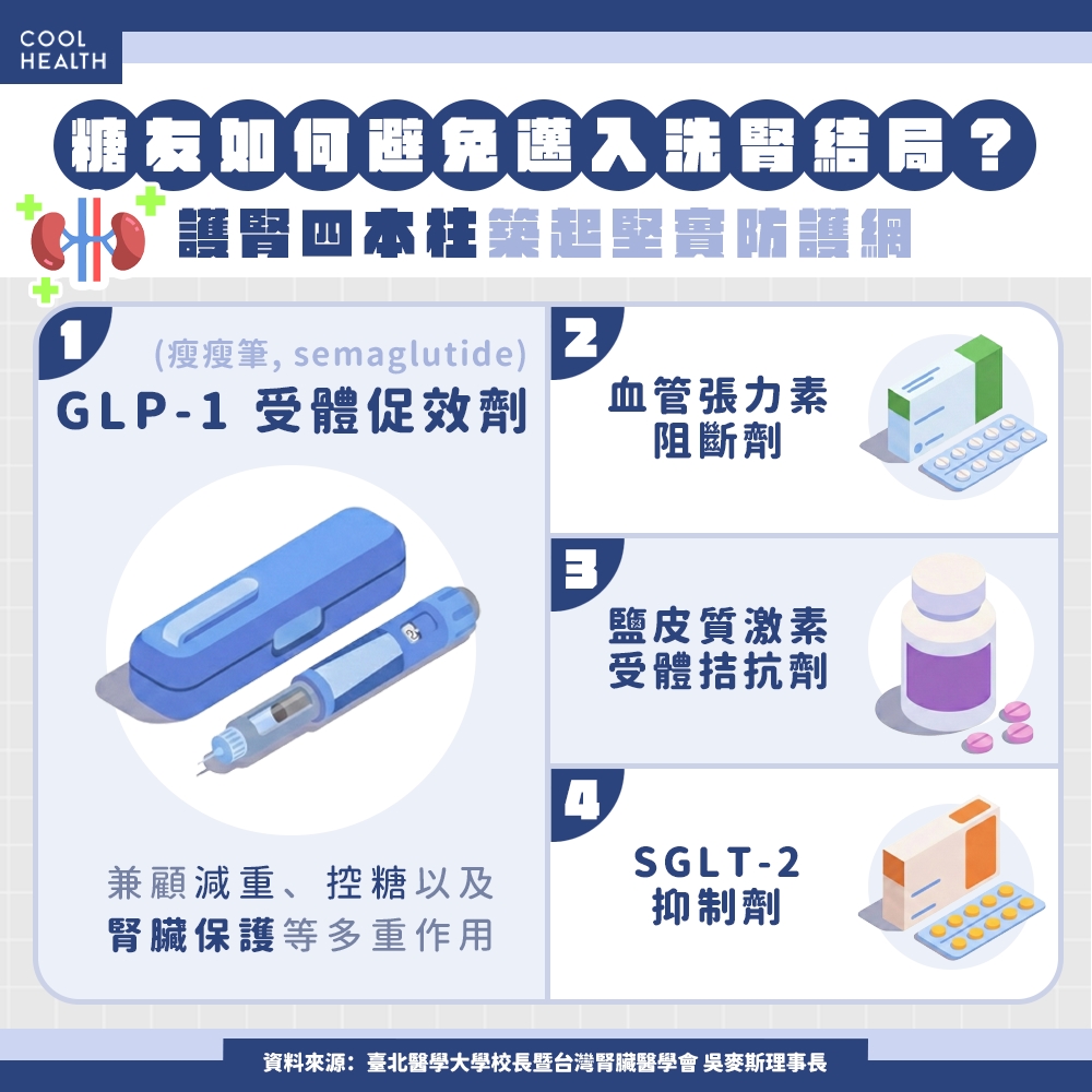 吳麥斯理事長說明,所謂四本柱藥物,分別指的是「血管張力素阻斷劑」、「SGLT-2抑制劑」、「鹽皮質激素受體拮抗劑(MRA)」與「GLP-1 受體促效劑(GLP-1 RA)」。其中GLP-1 受體促效劑(GLP-1 RA)被稱為「瘦瘦筆」(semaglutide, 週纖達、瑞倍適、胰妥讚),為一種類腸秘素針劑,為近2-3年最新的治療武器,其具備多重機轉,除了能幫助有效控制血糖,更具有降低體重與減少體內發炎反應的效果。對於同時飽受高血糖與肥胖折磨的患者來說,有兼顧減重、控糖以及腎臟保護等多重作用。