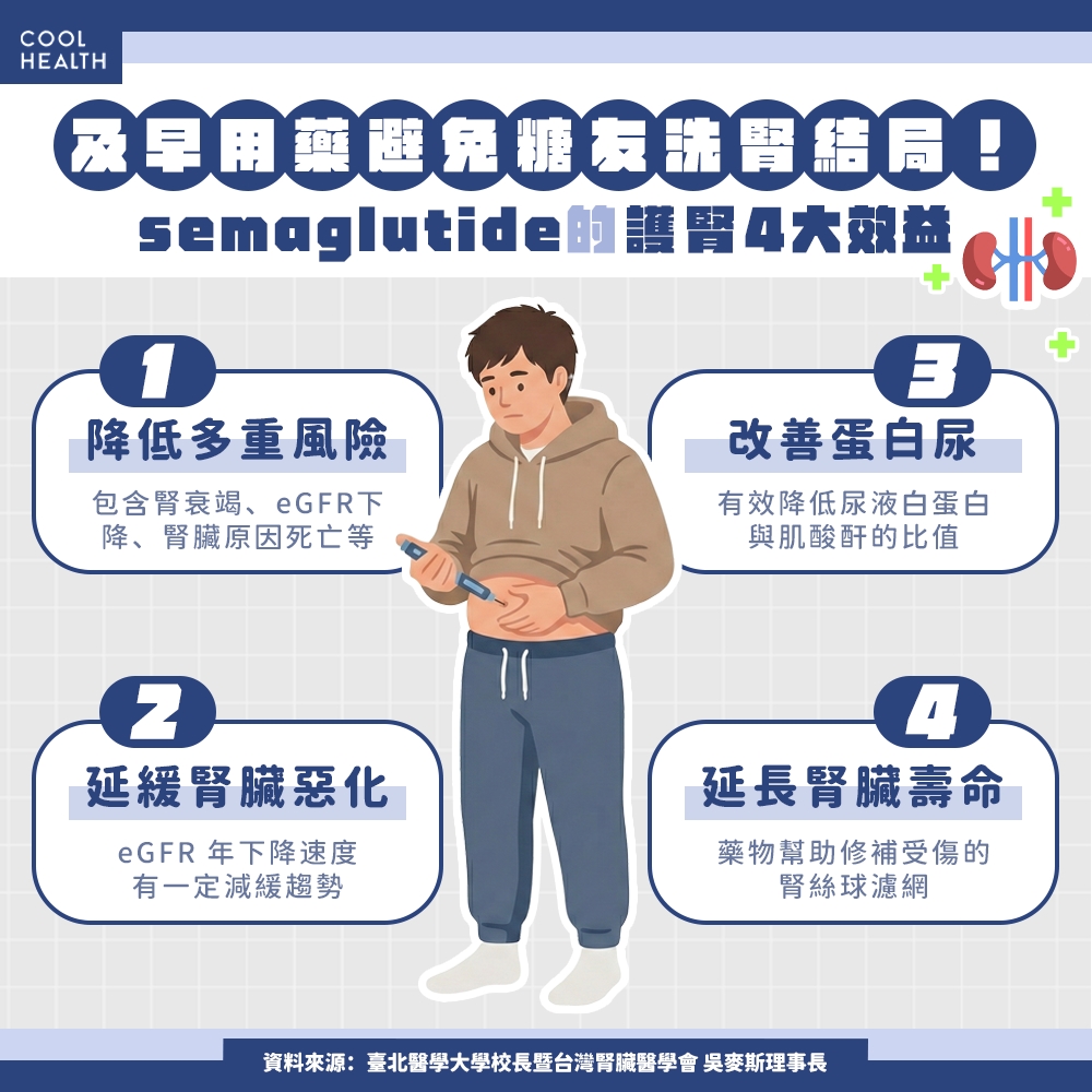 另外,針對semaglutide的研究亦證實,藥物介入後除了減少糖友的蛋白尿(修補受傷的腎絲球濾網)狀況,更重要的是幫助減緩eGFR隨年齡下降的速度,藉此成功拉長腎臟的使用壽命 。吳麥斯理事長補充,以目前糖尿病腎病變的治療趨勢來看,醫師會將這四類武器綜合運用,為每位病人量身打造最適合的個人化治療方案,力求在腎功能惡化前設下停損點。