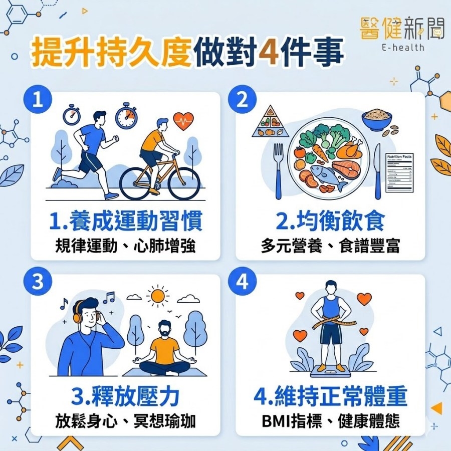 徐詣提醒,若透過改變日常生活習慣,仍無法解決「持久度」問題,建議尋求醫療專業人員協助,透過評估提供適合的治療方式,才能真正解決問題,避免影響日常生活,找回自信心。